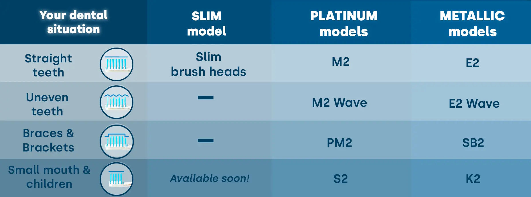 For the Platinum models you need our 4-pin brush heads, such as the M2, M2 Wave, S2 and PM2 models. Users of the Metallic , GO or Professional models should choose the 2-pin brush heads such as the E2, E2 Wave, SB2 or K2.