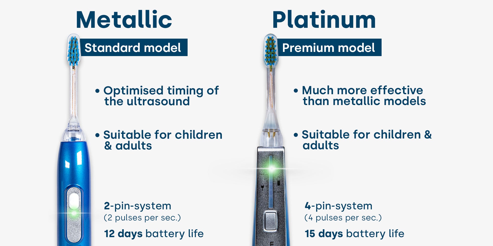 The emmi-dent Metallic ultrasonic toothbrush is the entry-level model of ultrasonic toothbrushes with a 2-pin system. This means that the Metallic model generates two ultrasonic pulses per second, making it a state-of-the-art ultrasonic toothbrush that enables effective yet gentle dental care. With the emmi-dent Metallic ultrasonic toothbrush, you're investing in high-quality dental care at a fair price.