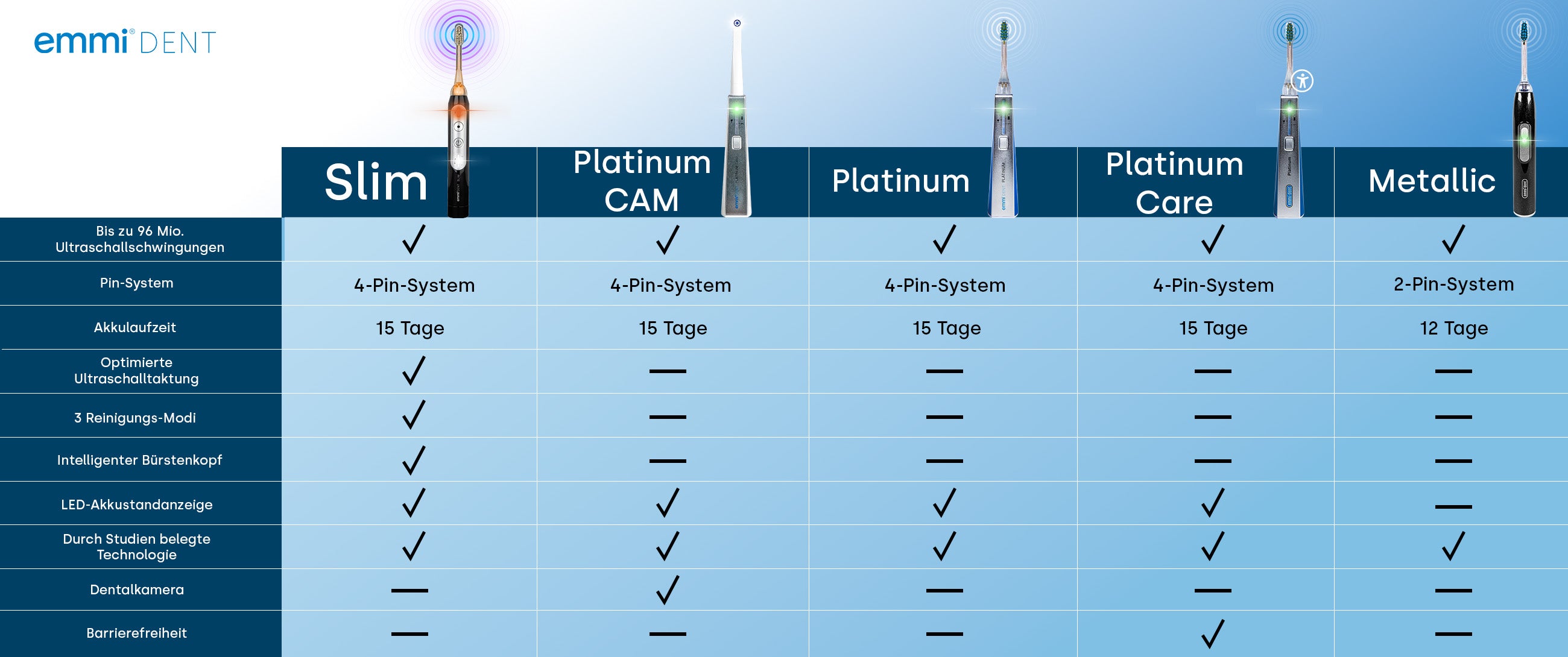 emmi-dent's ultrasonic toothbrushes offer the right model for every need. Whether for travel, daily use, or special needs, the differences are tailored to your individual requirements.