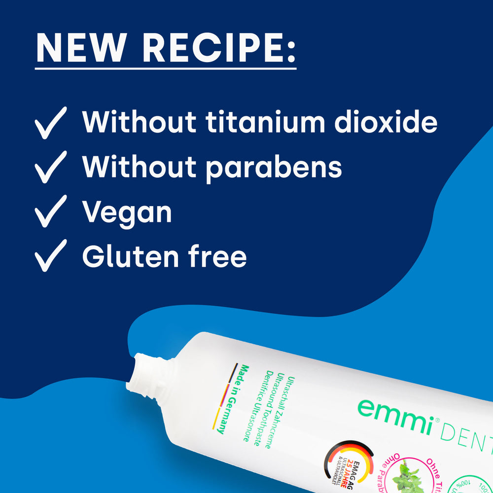 The best toothpaste without titanium dioxide is one that not only cleans and protects effectively, but also uses natural ingredients. One such toothpaste is our emmi-dent Fresh toothpaste. It does not contain any harmful substances such as titanium dioxide, parabens or gluten and is vegan. Instead, we rely on the power of natural ingredients such as xylitol and silica, which are known for their caring and caries-preventing properties. In addition, our innovative ultrasound technology ensures thorough cleaning even in the smallest gaps between teeth. This makes your dental care not only safer, but also more effective.