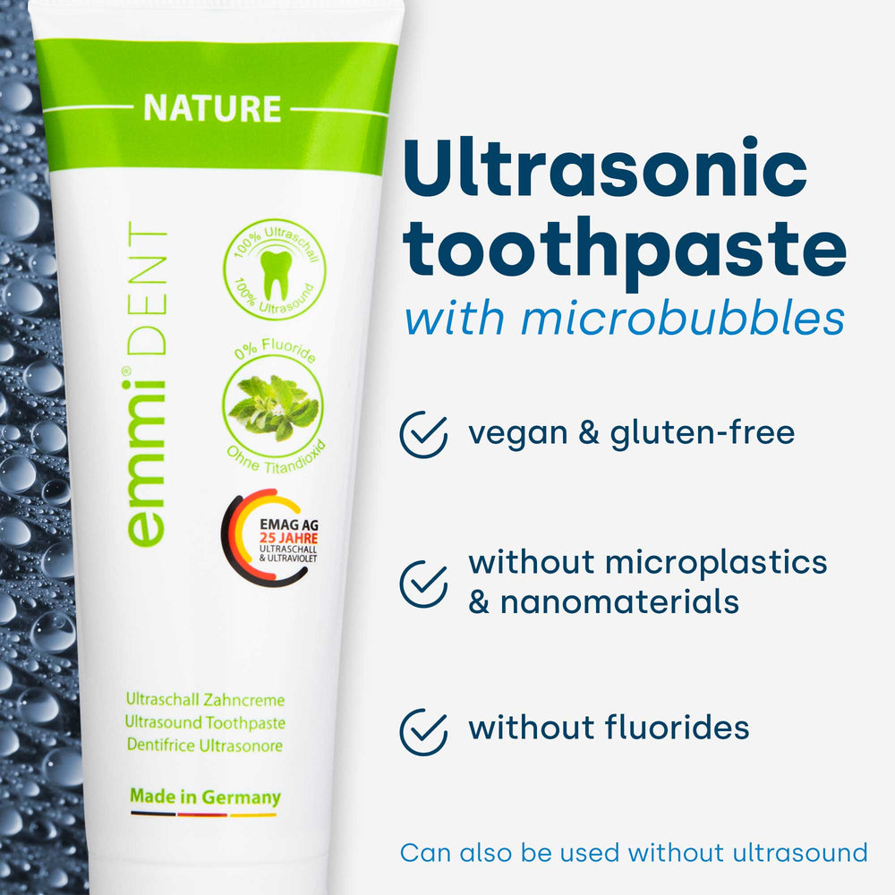 At emmi-dent, we place great value on quality and naturalness. Our Nature Ultrasonic toothpaste contains carefully selected natural ingredients that effectively care for and protect your teeth. Trust emmi-dent and enjoy the benefits of high-quality dental care without fluoride and titanium dioxide.