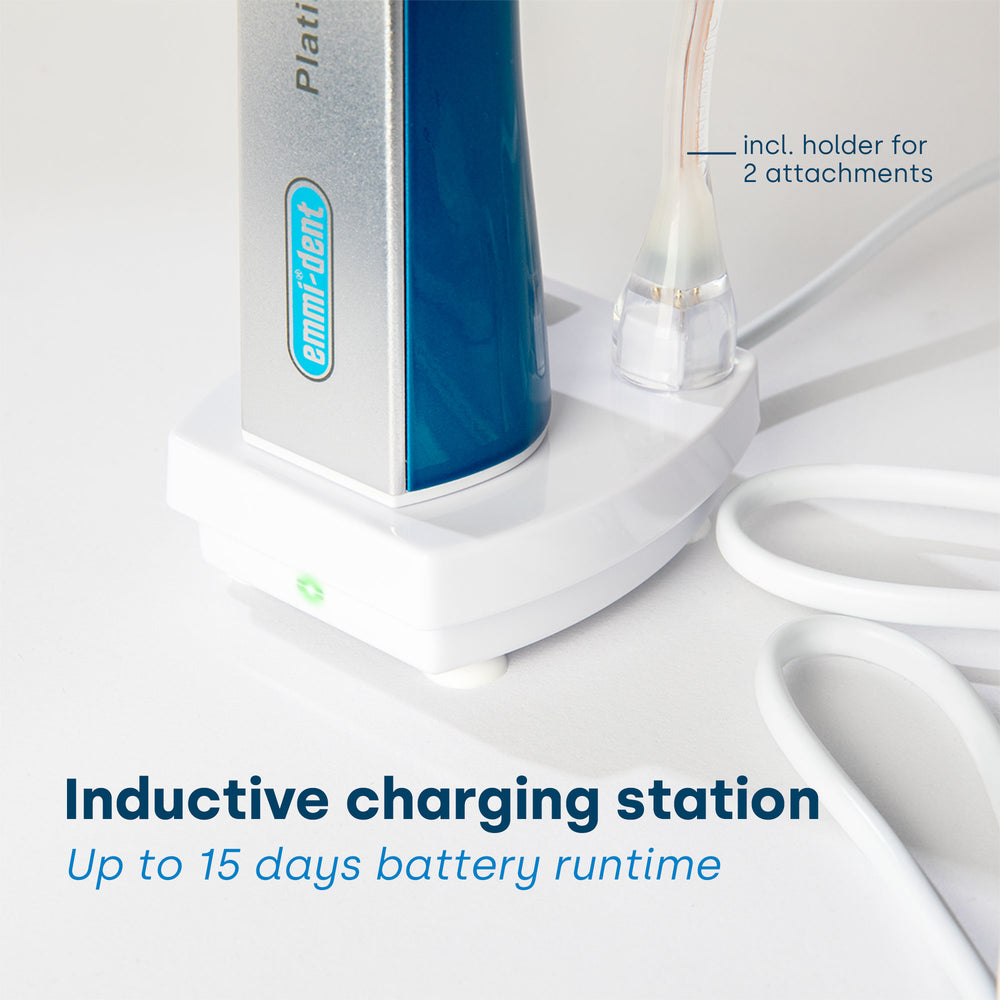 The emmi-dent Platinum uses advanced 4-pin technology that works with four pulses per second. The result is a much more effective cleaning than conventional toothbrushes, generating up to 96 million ultrasonic vibrations per minute. This technology ensures deep cleaning that can even reduce inflammation in the mouth - a result that has been confirmed by studies.