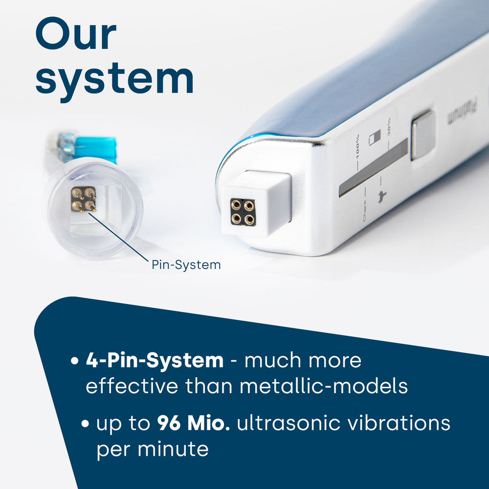 Ultrasonic technology is revolutionizing the way you clean and care for your teeth. The emmi-dent Platinum is the first generation of emmi-dent ultrasonic toothbrushes with a 4-pin system. This means that the emmi-dent Platinum generates up to 4 ultrasonic pulses per second.