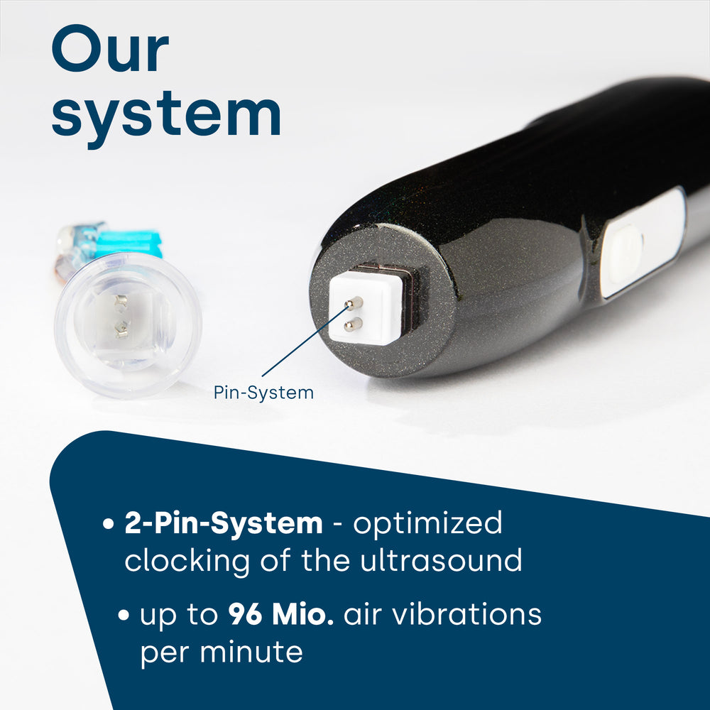Ultrasound reduces bacteria, even in gum pockets, reduces bad breath, and reaches even hard-to-reach areas such as interdental spaces. This sustainably reduces bacteria, making it ideal for braces and implant wearers.