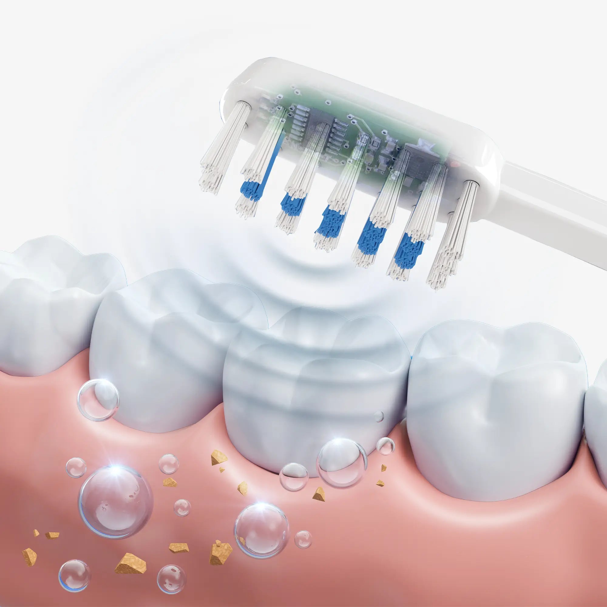 The ultrasound is neither audible nor noticeable and, in conjunction with a special ultrasonic toothpaste, creates millions of tiny microbubbles. Thanks to their small size, these penetrate even the smallest gaps between teeth, where they collapse and create a suction effect. This loosens contaminants such as biofilm and plaque. The vibrations of the ultrasonic toothbrush transport the loosened dirt out of the gaps. Then you simply rinse it out. The result is healthy, permanently cleaned and smooth teeth.