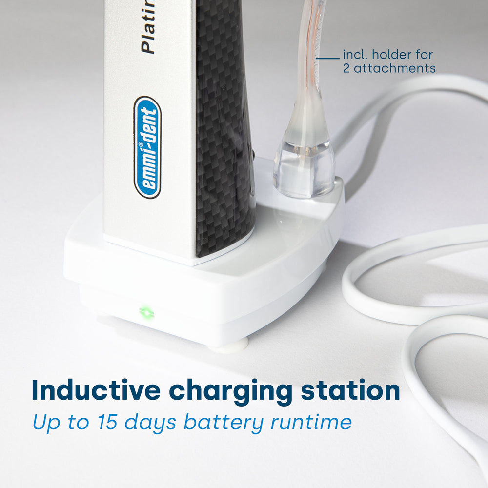 The emmi-dent Platinum uses advanced 4-pin technology that works with four pulses per second. The result is a much more effective cleaning than conventional toothbrushes, generating up to 96 million ultrasonic vibrations per minute. This technology ensures deep cleaning that can even reduce inflammation in the mouth - a result that has been confirmed by studies.