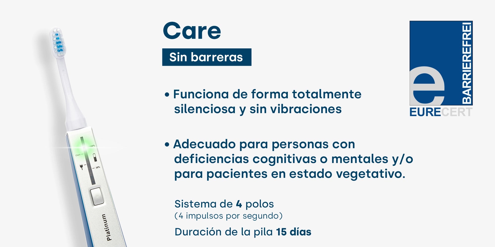 El cepillo de dientes ultrasónico emmi-dent Platinum Care no es un modelo más de nuestra familia de cepillos de dientes emmi-dent, sino más bien el desarrollo eficiente de nuestro cepillo de dientes ultrasónico “Platinum”; Adaptado a las necesidades de personas con movilidad reducida. Nuestro cepillo de dientes ultrasónico “Platinum Care” promete un cepillado dental revolucionario gracias al sello de calidad que le ha sido otorgado por su accesibilidad .