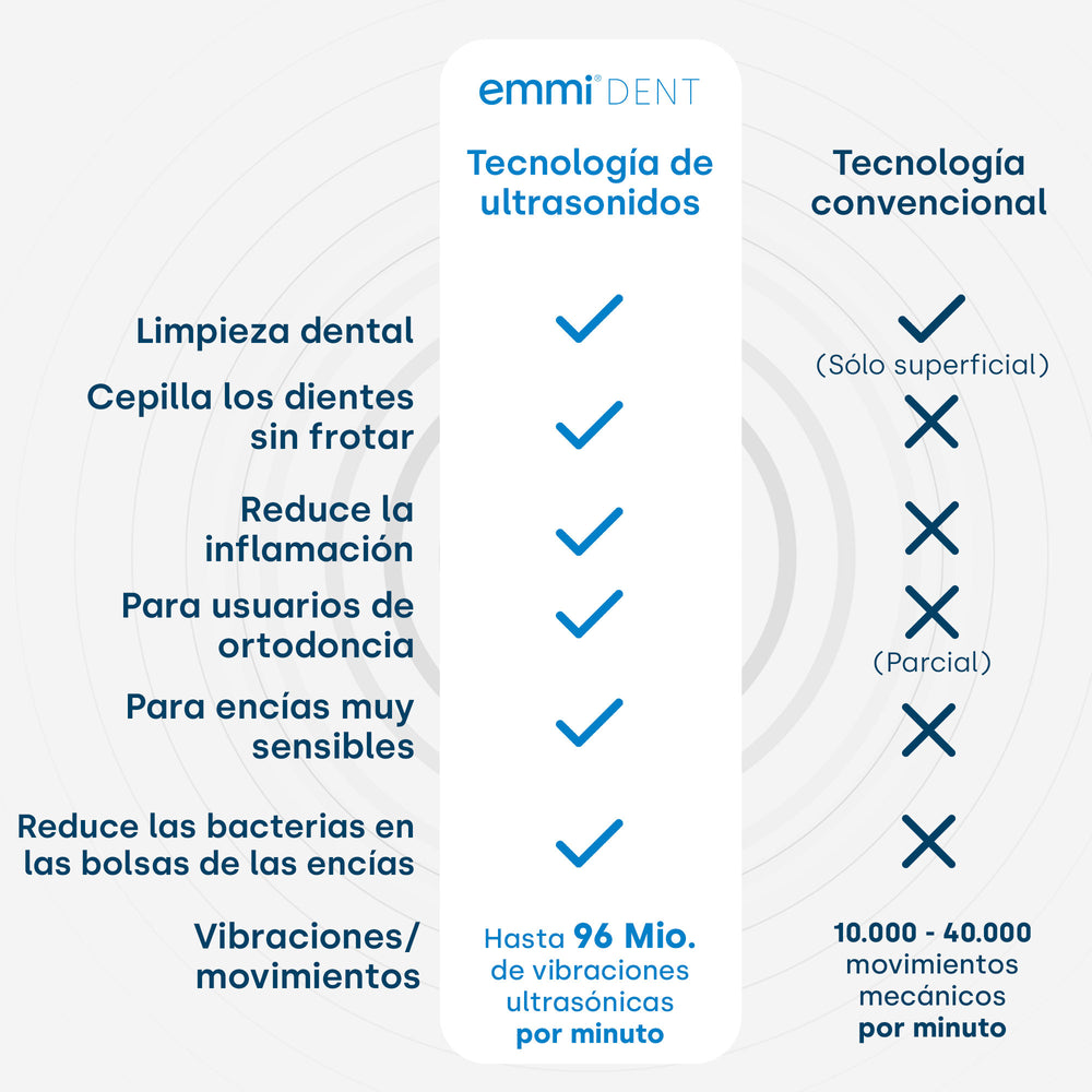 Los cepillos de dientes eléctricos incluyen cepillos de dientes rotatorios, cepillos de dientes sónicos y cepillos de dientes ultrasónicos. Mientras que los primeros suelen tener cepillos redondos que giran alternativamente de izquierda a derecha, los cepillos de dientes sónicos están equipados con cabezales alargados y vibratorios. Con 20.000 a 40.000 vibraciones por minuto consiguen movimientos mecánicos significativamente superiores a los de los cepillos rotativos. Los cepillos de dientes ultrasónicos superan este rendimiento muchas veces y también se basan en una tecnología diferente. Mientras que los cepillos de dientes rotatorios y sónicos eliminan el biofilm con ayuda de movimientos mecánicos, el emmi-dent trabaja con hasta 96 millones de vibraciones ultrasónicas por minuto y no requiere ningún movimiento mecánico para la limpieza de los dientes.