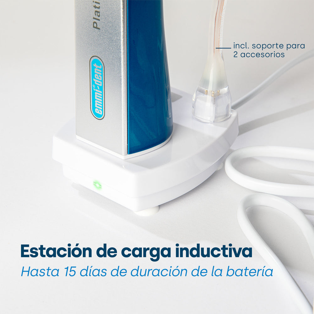 Los cepillos de dientes ultrasónicos son la cumbre de la innovación en el cuidado dental y ofrecen un rendimiento de limpieza que va mucho más allá de lo que es posible con los cepillos de dientes eléctricos tradicionales. Al elegir el mejor cepillo de dientes ultrasónico, debe prestar atención a los factores que afectan tanto la eficiencia de la limpieza como la facilidad de uso. Nuestro cepillo de dientes ultrasónico emmi-dent Platinum está a la vanguardia de esta revolución tecnológica y cumple todos los criterios de un excelente cepillo de dientes ultrasónico: 100% ultrasónico: a diferencia de los cepillos de dientes sónicos, que se basan en movimientos mecánicos, nuestro emmi-dent Platinum funciona con vibraciones ultrasónicas puras: hasta 96 millones de vibraciones por minuto. Esta alta frecuencia permite una limpieza profunda sin contacto mecánico, minimizando el riesgo de lesiones y ofreciendo resultados de limpieza insuperables. La vibración se puede desactivar: emmi-dent Platinum ofrece la opción de desactivar la vibración. Esto garantiza un cuidado personalizado, ya sea para encías sensibles o para una eliminación intensiva de placa, ¡todo ello sin frotar ni vibrar! Batería de larga duración: con una duración de batería de hasta 15 días cuando se usa dos veces al día, nuestro cepillo de dientes ultrasónico establece nuevos estándares en términos de resistencia y elimina la necesidad de una carga frecuente. Acabado de alta calidad: El emmi-dent Platinum se caracteriza por un potente motor y una carcasa resistente al agua, lo que garantiza un uso duradero y fiable. Diversos cabezales de cepillo: Para combinar con nuestro cepillo de dientes ultrasónico, ofrecemos una selección de cabezales de cepillo que están diseñados para diferentes aplicaciones y necesidades del usuario para permitir una limpieza individual y efectiva. El emmi-dent Platinum se distingue de otros cepillos de dientes ultrasónicos por su tecnología avanzada y su orientación al usuario. Entonces, si está buscando el mejor cepillo de dientes ultrasónico, el emmi-dent Platinum le ofrece una combinación de limpieza eficaz, comodidad y tecnología avanzada que garantiza el máximo rendimiento de limpieza e higiene bucal al cepillarse los dientes.