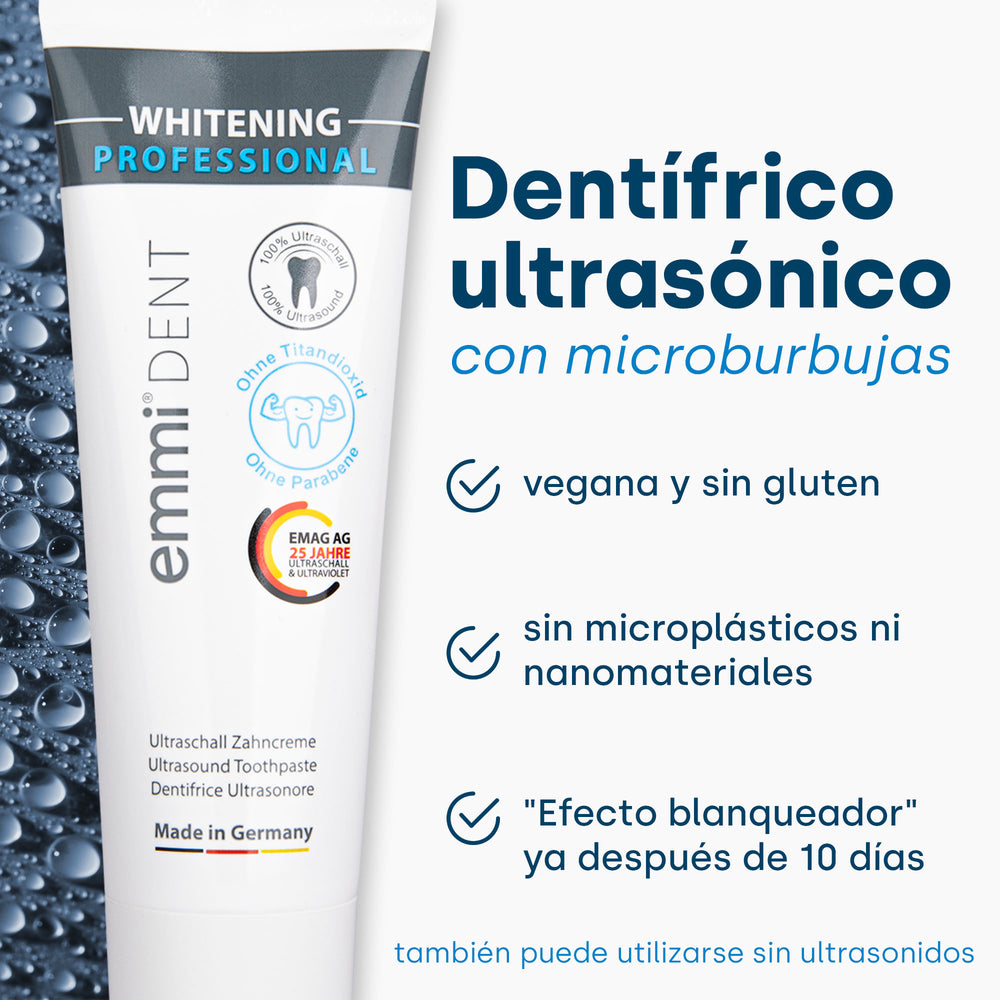 Las ondas ultrasónicas penetran profundamente en los espacios entre los dientes y la línea de las encías, disolviendo eficazmente las bacterias y la placa. Esto ayuda a prevenir la caries, la gingivitis y otras enfermedades dentales. Para obtener resultados aún más completos, se utiliza la pasta de dientes ultrasónica emmi-dent especialmente desarrollada. Las microburbujas contenidas potencian el efecto de la tecnología ultrasónica y garantizan así una limpieza y un cuidado bucal aún más eficaces.