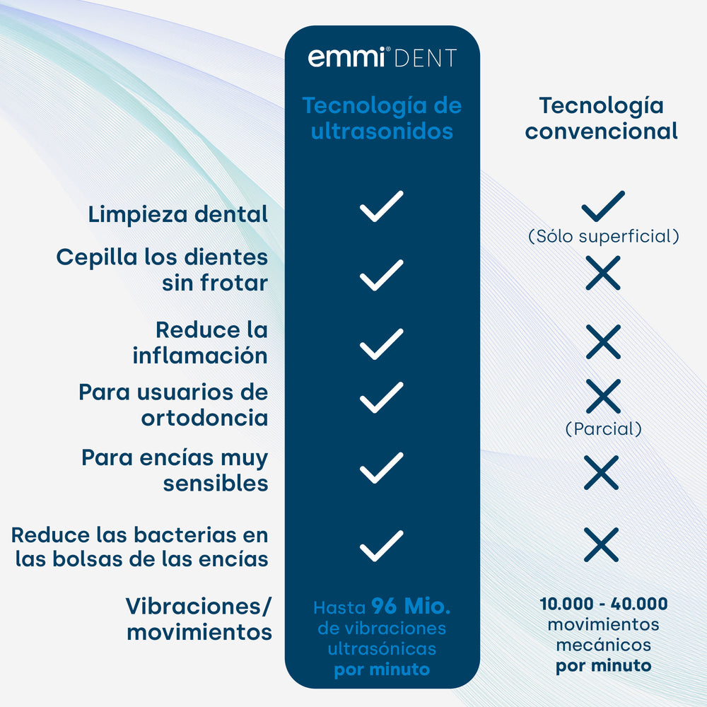 Las ondas ultrasónicas penetran profundamente en los espacios entre los dientes y la línea de las encías. Allí disuelven las bacterias y la placa, lo que previene eficazmente la caries, la gingivitis y otras enfermedades dentales. Para obtener resultados especialmente minuciosos se utiliza la pasta de dientes ultrasónica emmi-dent especialmente desarrollada. Las microburbujas incluidas mejoran enormemente el efecto del ultrasonido.