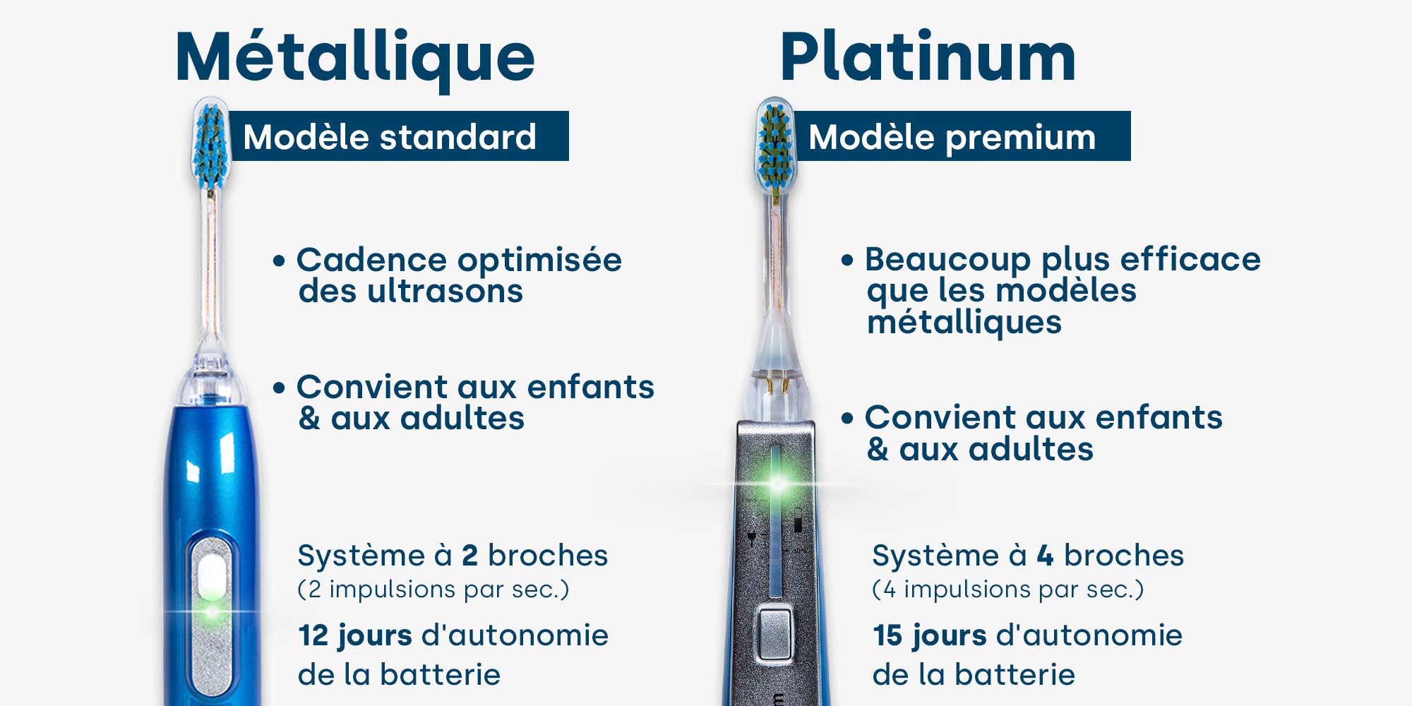 Bien que les brosses à dents soniques aient un pouvoir nettoyant, les brosses à dents à ultrasons offrent une expérience de nettoyage plus intensive sans endommager l'émail des dents. La fréquence des ondes ultrasoniques signifie que les brosses à dents à ultrasons ne nécessitent aucun mouvement mécanique comme les brosses à dents électriques classiques. Cela signifie qu'il n'y a aucun risque de « frotter » accidentellement l'émail des dents en cas d'utilisation incorrecte. Les vibrations ultra-rapides peuvent pénétrer plus profondément dans les espaces entre les dents et le long de la ligne des gencives pour éliminer plus efficacement le biofilm, la plaque dentaire et les bactéries.