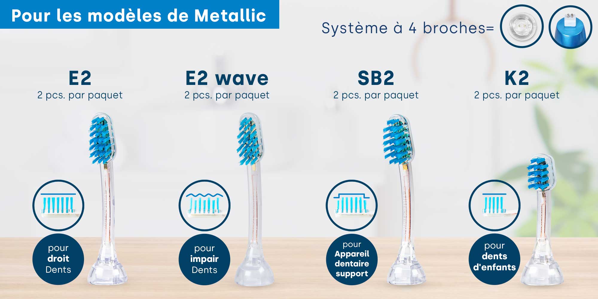 Pour les modèles Platinum, vous avez besoin de nos têtes de brosse à 4 broches, telles que les modèles M2, M2 Wave, S2 et PM2. Les utilisateurs des modèles Metallic , GO ou Professional doivent choisir les têtes de brosse à 2 broches telles que E2, E2 Wave, SB2 ou K2.