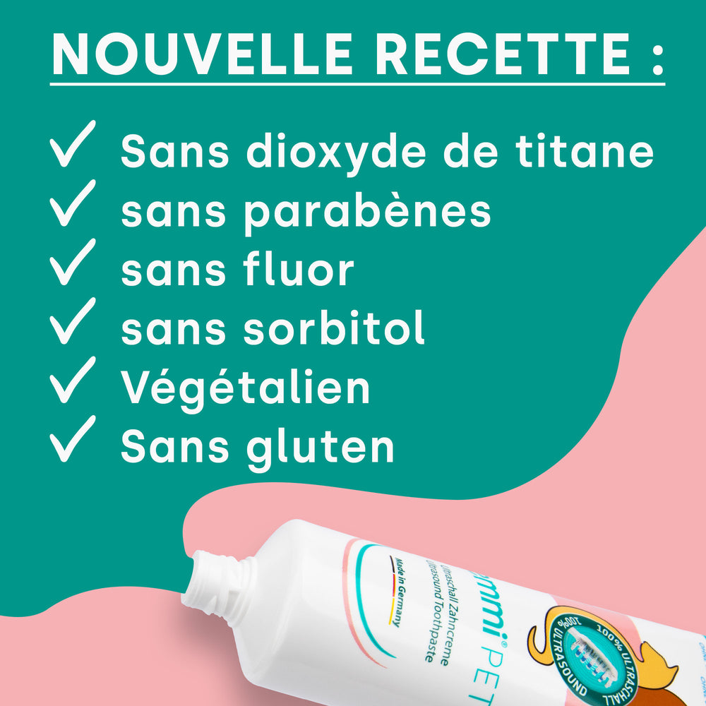 L'emmi-pet 2.0 est basé sur une technologie ultrasonique brevetée (jusqu'à 96 millions de vibrations ultrasoniques par minute) et, lorsqu'il est utilisé régulièrement, prévient efficacement le tartre et réduit la plaque dentaire. Une utilisation régulière prévient non seulement la formation de plaque dentaire, mais masse et renforce également les gencives et réduit l'inflammation des gencives existante.