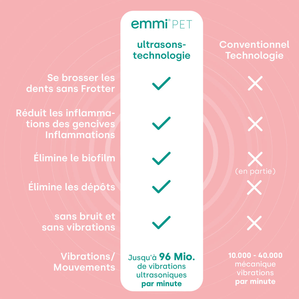 Le kit de base emmi-pet PRO contient deux têtes de brosse spécialement développées (1 x grande, 1 x petite), qui conviennent aussi bien aux petits qu'aux grands chiens. Avec le dentifrice à ultrasons emmi-pet, sans dioxyde de titane ni parabènes, les soins dentaires deviennent encore plus sûrs et plus doux.