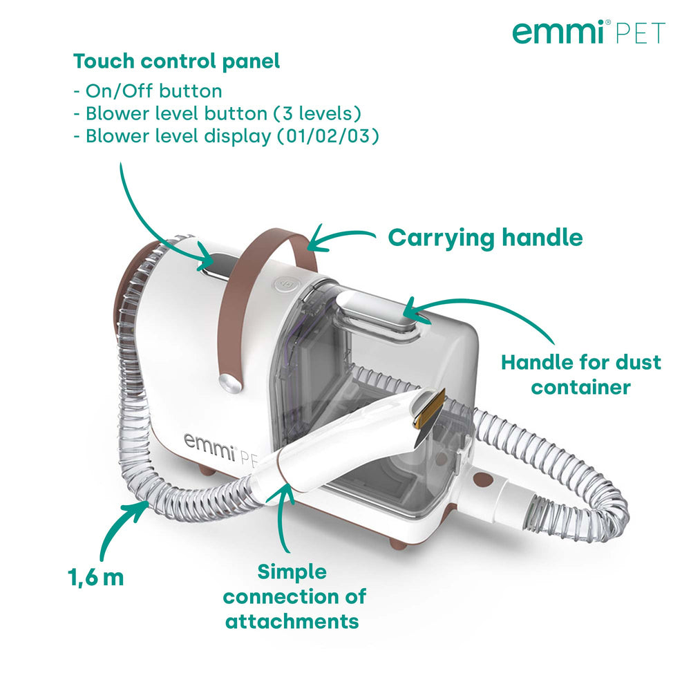Appareil tout-en-un : Emmi-pet Grooming Kit Home combine tondeuse, peigne et aspirateur en un seul appareil. La conception unique vous permet de couper et d'aspirer les cheveux en même temps, vous n'aurez donc plus jamais à vous soucier des cheveux rebelles. Cela rend les soins apportés à votre animal de compagnie simples et efficaces.