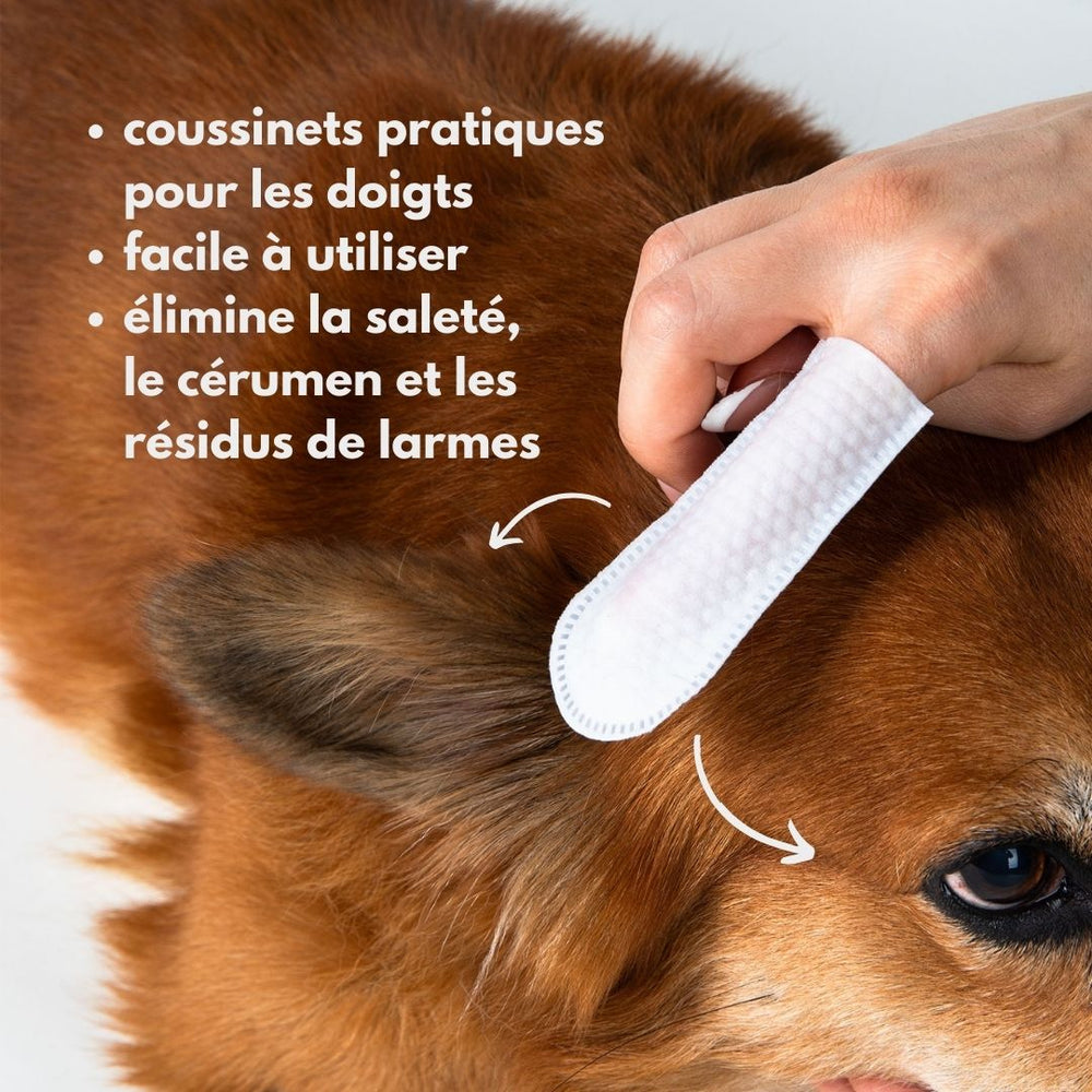 Le nettoyage des yeux est également une mesure de soin importante pour prévenir les problèmes oculaires. Pour ce faire, essuyez chaque jour le contour des yeux avec vos doigtiers pour éliminer les résidus de larmes et les impuretés. Les doigtiers sont faciles à utiliser et peuvent être facilement jetés après utilisation.