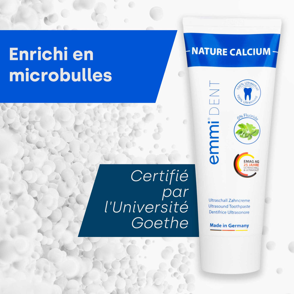 Le dentifrice ultrasonique emmi-dent Nature Calcium contient du calcium de haute qualité qui renforce vos dents et reminéralise l'émail des dents. En renforçant l’émail, vos dents deviennent plus résistantes aux attaques acides et à la carie dentaire. Faites confiance à emmi-dent et offrez à vos dents le renforcement naturel qu’elles méritent.