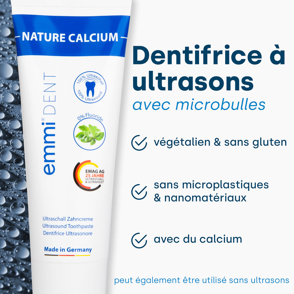 Chez emmi-dent, nous misons sur la qualité et le naturel. Notre dentifrice ultrasonique Nature Calcium contient des ingrédients naturels soigneusement sélectionnés qui prennent soin de vos dents et les renforcent en douceur. Bénéficiez de soins dentaires adaptés aux besoins naturels de vos dents et vous procurant un sourire radieux.