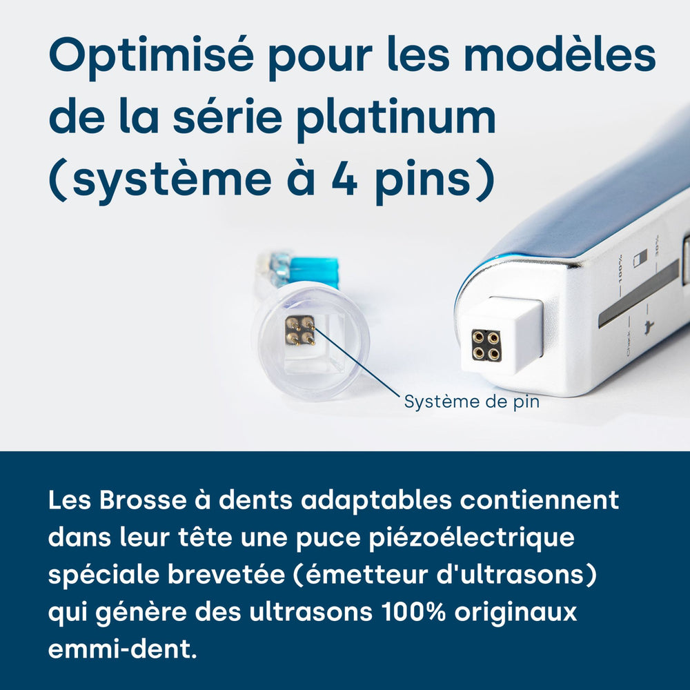 Veuillez noter que la tête de brosse à ultrasons emmi-dent Platinum ne peut être utilisée pour le nettoyage des dents et l'hygiène bucco-dentaire qu'avec le modèle premium emmi-dent Platinum.