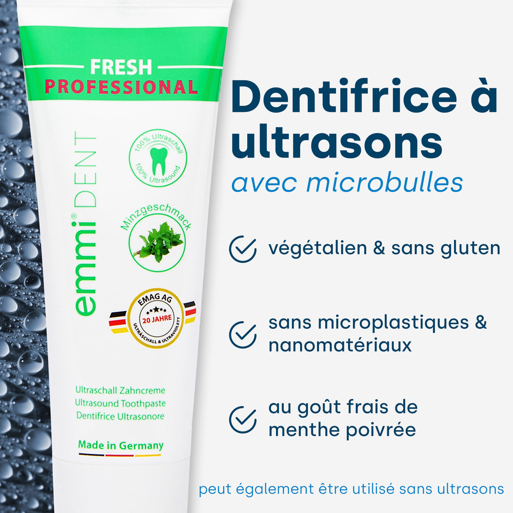Les ondes ultrasoniques pénètrent profondément dans les espaces entre les dents et la ligne des gencives, dissolvant efficacement les bactéries et la plaque. Cela aide à prévenir la carie dentaire, la gingivite et d’autres maladies dentaires. Pour des résultats encore plus approfondis, le dentifrice à ultrasons emmi-dent spécialement développé est utilisé. Les microbulles contenues renforcent l'effet de la technologie à ultrasons et assurent ainsi un nettoyage et un soin bucco-dentaire encore plus efficaces.