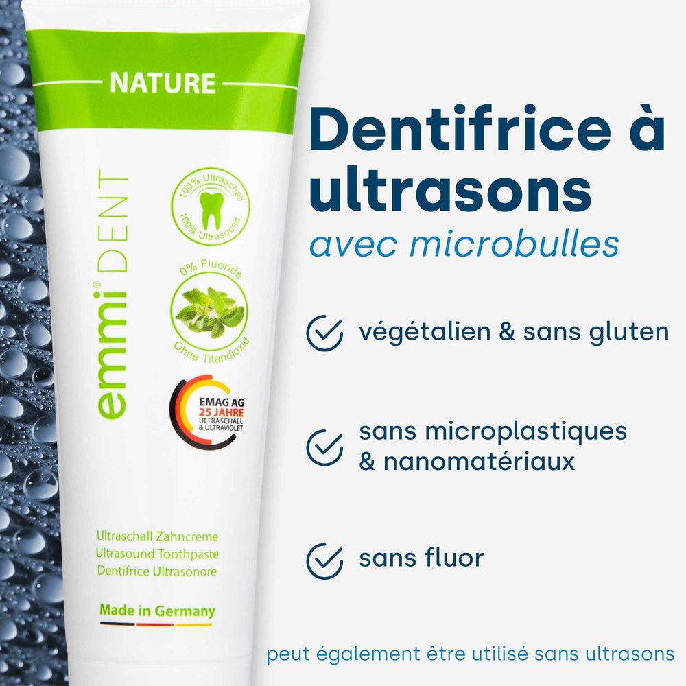 L'emmi-dent Platinum utilise un dentifrice ultrasonique spécial qui contient les microbulles nécessaires, qui sont environ 1000 fois plus petites que les bulles de dentifrice classiques. Ces microbulles sont ajoutées lors d’une étape supplémentaire du processus de production pour garantir une expérience de nettoyage optimale – retrouvez l’étude sur leur existence ici. Considérez les cinq différentes options de dentifrice disponibles pour emmi-dent et leurs avantages et caractéristiques respectifs.