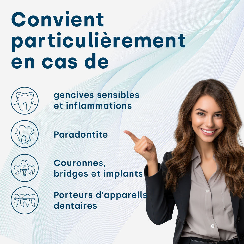 L'emmi-dent Slim nettoie vos dents par ultrasons sans frotter. Ceci est particulièrement doux pour les gencives sensibles, les implants, les appareils dentaires ou les maladies dentaires telles que la parodontite.
