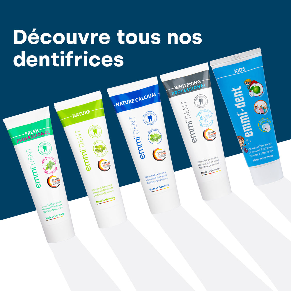 N'attendez plus et donnez vie à votre sourire radieux ! Commandez maintenant le dentifrice blanchissant à ultrasons emmi-dent et découvrez une nouvelle dimension dans les soins dentaires.