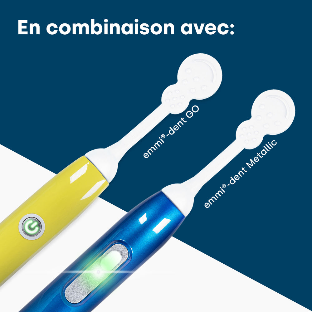 La brosse à dents à ultrasons emmi-dent est particulièrement adaptée aux dents ou aux gencives sensibles grâce à son application sans abrasion.