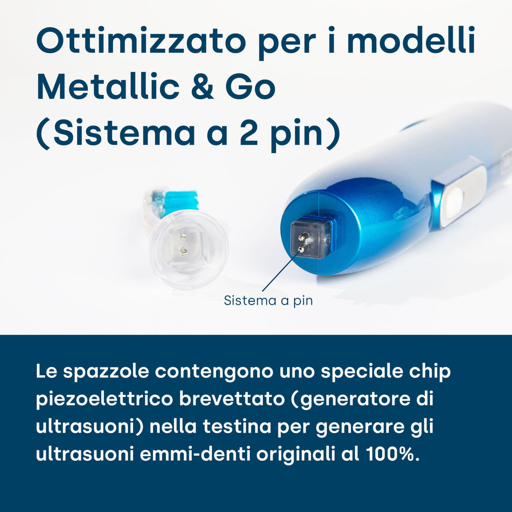 Le testine ultrasoniche degli spazzolini a ultrasuoni emmi-dent contengono uno speciale chip piezoelettrico brevettato (generatore di ultrasuoni) nella testina per generare gli ultrasuoni emmi-dent originali al 100%. Nelle basi delle testine degli spazzolini ultrasonici Emmi-dent Metallic e Go sono integrati due perni di contatto temprati per il collegamento al manipolo Emmi-dent Metallic e Go. Questa innovazione impedisce che si inceppi durante l'inserimento della spina e la testina della spazzola ultrasonica può essere inserita e rimossa facilmente.