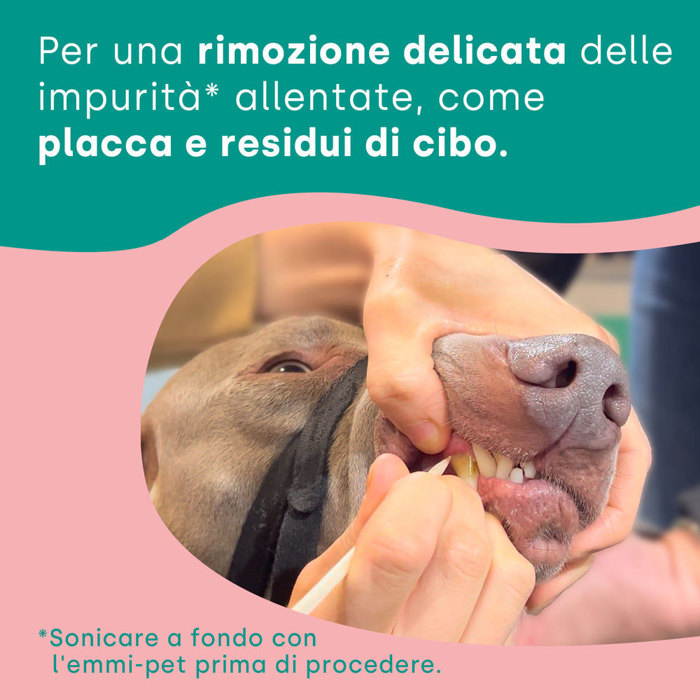 Il set base emmi-pet è adatto a tutti i proprietari di animali domestici che hanno a cuore la salute e la cura del loro amico a quattro zampe. Questo set contiene tutto il necessario per rimuovere in modo indolore, delicato e completo la placca e i batteri dal tuo animale domestico.