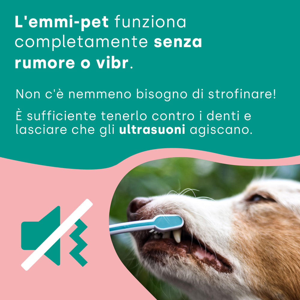 L'offerta comprende lo spazzolino ultrasonico emmi-pet , una stazione di ricarica, due testine per spazzolino ultrasonico emmi-pet ( 1 grande / 1 piccola ) e il dentifricio ultrasonico emmi-pet per animali .