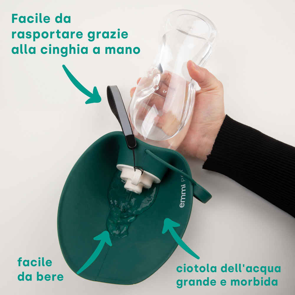 La nostra borraccia da asporto per cani è dotata di un cinturino da polso, che garantisce un trasporto confortevole. La bottiglia è a prova di perdite e si adatta a qualsiasi borsa o zaino. Il coperchio della bottiglia funge anche da ciotola per l'acqua, così il cane può bere direttamente da lì. La borraccia per cani emmi-pet con una capacità di 580 ml è l'accessorio ideale per garantire al tuo cane acqua a sufficienza anche quando è in giro. È leggero, maneggevole e adatto a cani di tutte le taglie.
