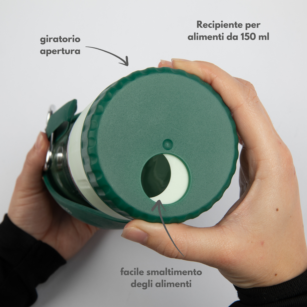 • Contenitore per snack integrato: 150 ml extra per cibo o snack, perfetto per piccole ricompense da portare con sé.