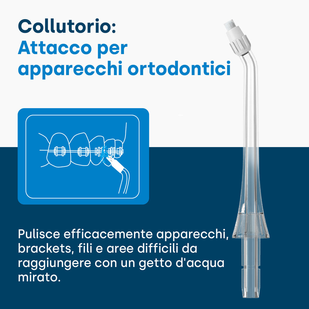 Abbiamo l'ugello più adatto per ogni applicazione! Grazie ai quattro ugelli di attacco inclusi, avrai l'ugello giusto per ogni attività di pulizia. Che si tratti di apparecchi ortodontici, ponti o impianti, l'irrigatore orale è ideale per rimuovere i depositi negli spazi tra i denti o in altre zone difficili da raggiungere.