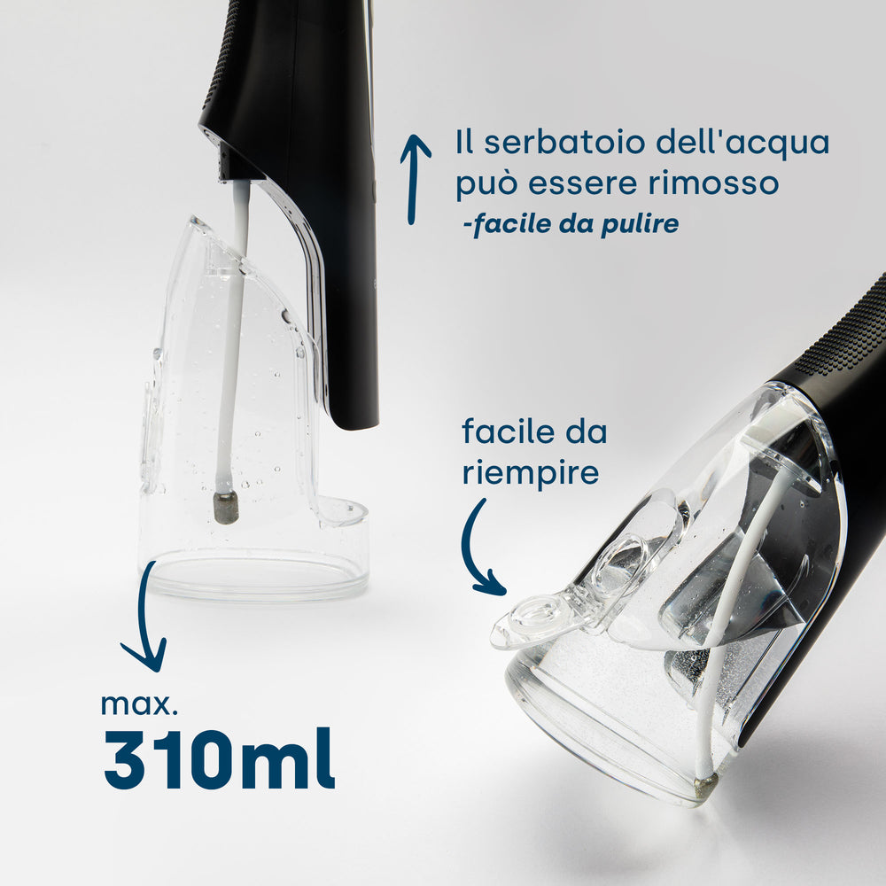 L'idropulsore è impermeabile secondo lo standard IPX7 e può essere utilizzato a casa o in viaggio. Il serbatoio integrato da 300 ml può essere facilmente rimosso per la pulizia. Anche l'ugello può essere facilmente rimosso per sostituire gli accessori.
