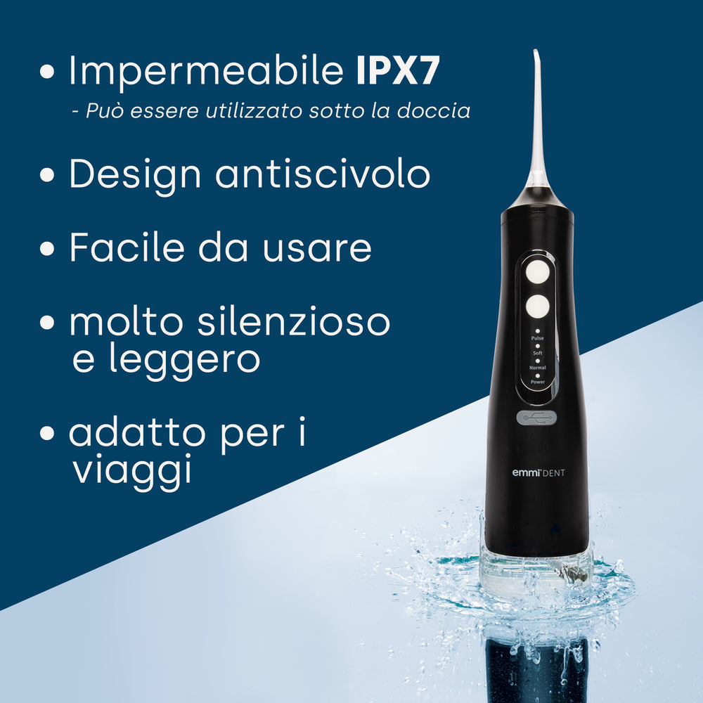 Gli idropulsori orali sono disponibili in vari modelli: dai modelli che si collegano direttamente al rubinetto e che quindi limitano la libertà di movimento tramite un tubo dell'acqua, agli idropulsori orali fissi con un serbatoio dell'acqua esterno, che sono anche limitati nella loro maneggevolezza. emmi-dent ha riconosciuto queste sfide e ha sviluppato una soluzione innovativa: un irrigatore orale pratico, semplice ed efficace. L'idropulsore elettrico emmi-dent è caratterizzato dal suo design senza fili, che consente una mobilità illimitata in tutta la cavità orale. Dotato di un capiente serbatoio d'acqua e di una batteria integrata, offre la massima praticità senza fastidiosi cavi o tubi flessibili. Basta riempire il serbatoio con acqua e caricare la batteria: il dispositivo è pronto all'uso. Inoltre, l'idropulsore emmi-dent è il compagno ideale quando si viaggia grazie alle sue dimensioni compatte. I vantaggi dell'idropulsore emmi-dent: - Senza fili per una libertà di movimento illimitata - Design compatto, perfetto per chi è in movimento - Serbatoio dell'acqua da 300 ml nel manipolo per un facile riempimento - Facile ricarica della batteria tramite USB-C (carica per 4 ore, utilizzo per 60 giorni) Se stai cercando un prodotto che si adatti perfettamente al tuo stile di vita e alle tue esigenze di attenta igiene dentale, l'idropulsore emmi-dent offre una soluzione su misura. Sviluppato per gli utenti che apprezzano un'igiene orale accurata e rilassata sia all'inizio della giornata che alla fine della serata, stabilisce nuovi standard nella pulizia dei denti.