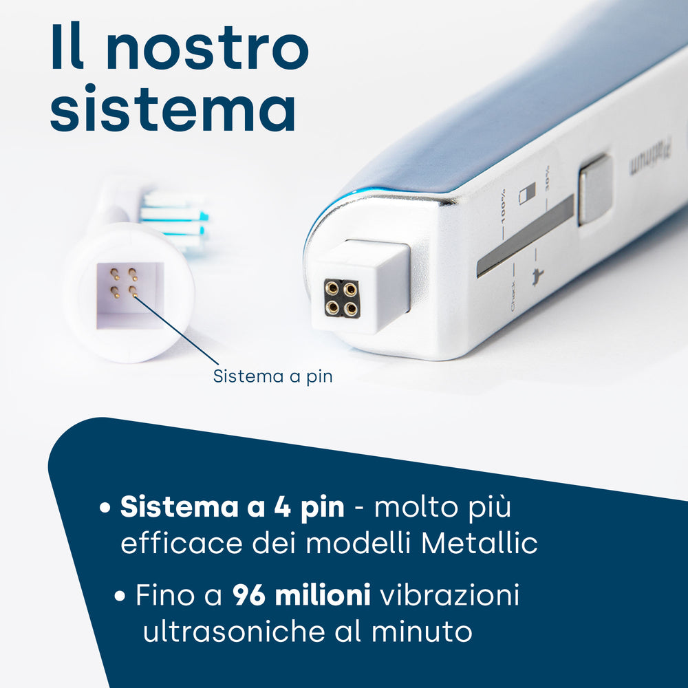 - Pulizia approfondita: la tecnologia ad ultrasuoni rimuove placca e batteri senza spazzolatura meccanica.
