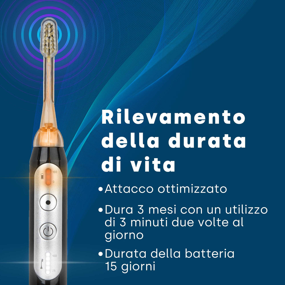 La funzionalità specifica dello spazzolino ad ultrasuoni ne influenza l'utilizzo. Gli spazzolini tradizionali vengono fatti scorrere lungo le file dei denti e sono sempre a contatto con essi. La nostra sofisticata tecnologia a ultrasuoni funziona praticamente senza contatto. Basta muovere delicatamente la testina dello spazzolino sui denti. Oltre allo spazzolino ultrasonico, utilizzare uno speciale dentifricio ultrasonico. 75 millilitri sono sufficienti per circa quattro settimane di utilizzo.
