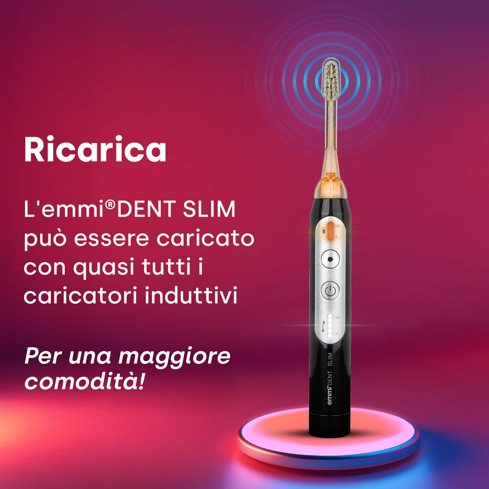 Emmi-dent Slim pulisce i denti tramite ultrasuoni, senza strofinare. Questo trattamento è particolarmente delicato in caso di gengive sensibili, impianti, apparecchi ortodontici o patologie dentali come la parodontite.