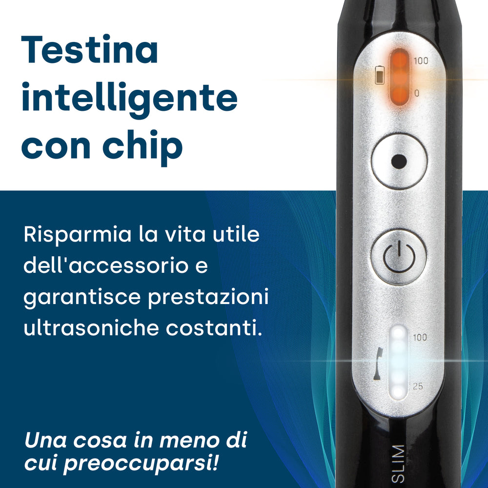 Abbiamo sviluppato una testina speciale per le persone che portano l'apparecchio ortodontico. Le vibrazioni ultrasoniche puliscono a fondo anche le zone inaccessibili tra denti e apparecchi ortodontici. Anche le persone con impianti dentali traggono vantaggio dalle massime prestazioni di pulizia dell'innovativa tecnologia a ultrasuoni.