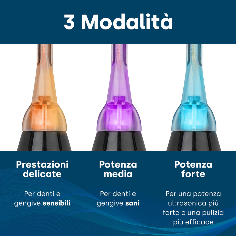 Gli spazzolini elettrici includono gli spazzolini rotanti, gli spazzolini sonici e gli spazzolini ad ultrasuoni. Mentre i primi solitamente hanno spazzole rotonde che ruotano alternativamente da sinistra a destra, gli spazzolini sonici sono dotati di testine allungate e vibranti. Con 20.000 - 40.000 vibrazioni al minuto, realizzano movimenti meccanici notevolmente più elevati rispetto alle spazzole rotanti. Gli spazzolini ad ultrasuoni superano di gran lunga questa prestazione e sono