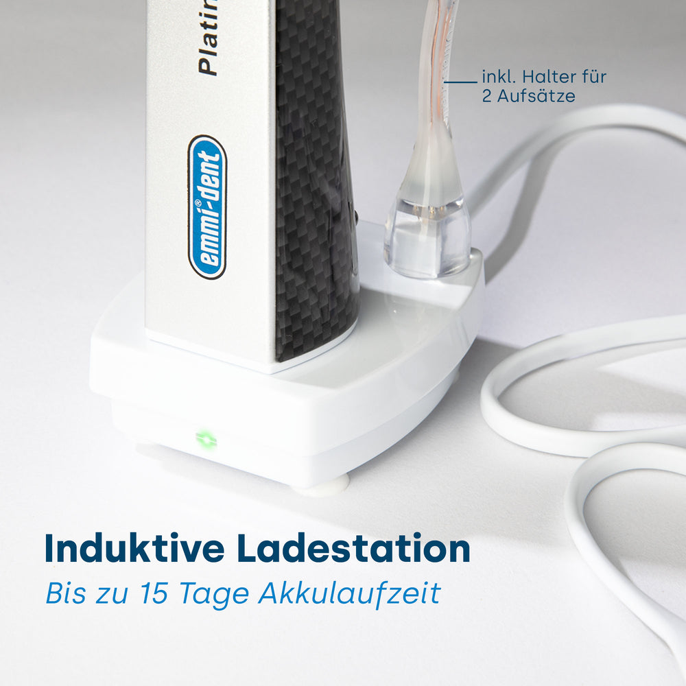 Die emmi-dent Platinum verfügt über eine längere Batterielebensdauer als seine Vorgängermodelle. Bei regelmäßigem Gebrauch von 2–3-mal pro Tag kann die Platinum bis zu 15 Tage durchhalten, bevor sie wieder aufgeladen werden muss. Diese verlängerte Akkulaufzeit (Lithium-Ionen) bietet Komfort und ununterbrochene Nutzung und macht ein häufiges Aufladen überflüssig.