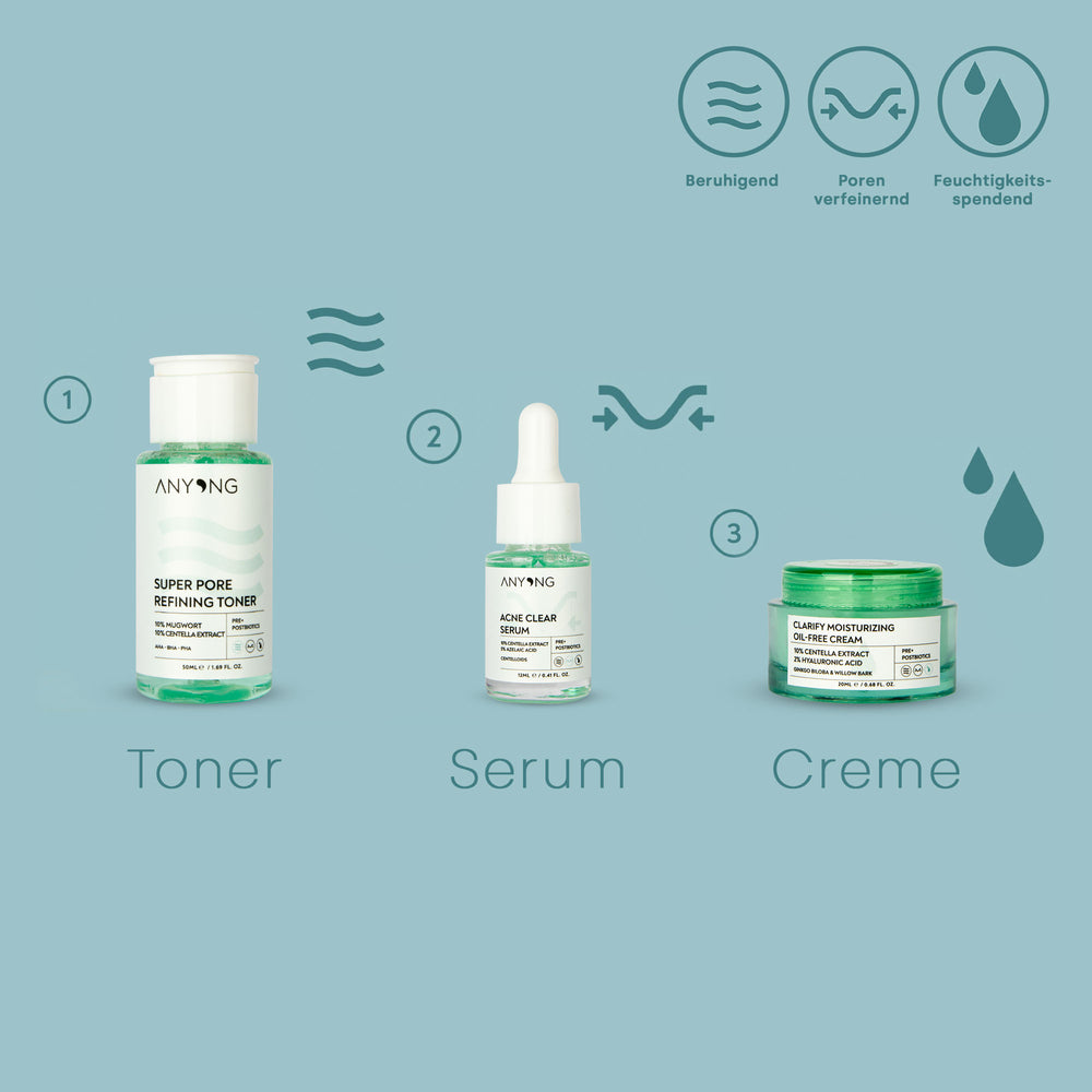 Das ideale Kit gegen unreine Haut. Der Pore Refining Toner entfernt überschüssige Öle und sorgt damit für ein ideales Vorspiel. Der Höhepunkt zur reinen Haut ist das Acne Clear Serum, welches Cantella Extrakt und Azelainsäure in sich trägt. Es reagiert gezielt auf deine Hautprobleme und regeneriert dein Hautbild. Zum kuscheligen Abschluss dient die ölfreie und klärende Feuchtigkeitscreme.