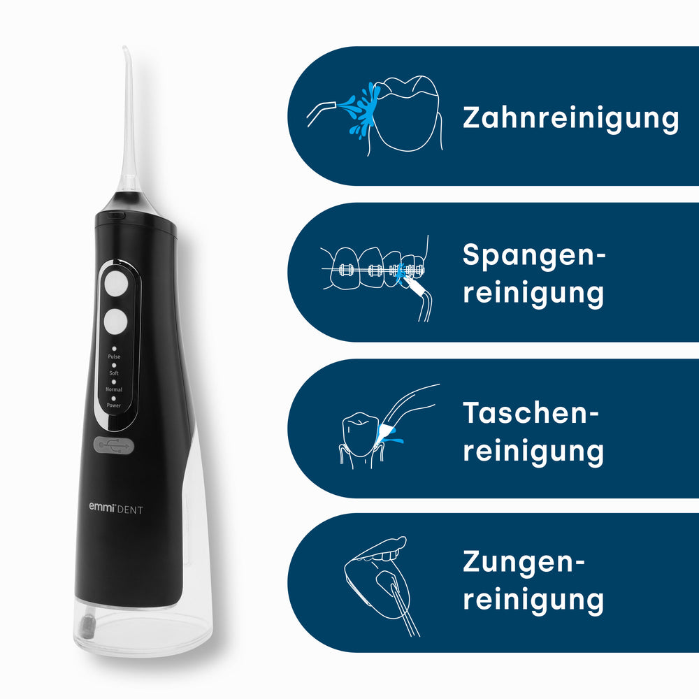 Die emmi-dent Slim reinigt Ihre Zähne mit Ultraschall ganz ohne Schrubben. Das ist besonders schonend für empfindliches Zahnfleisch, Implantate, Zahnspangen oder bei Zahnerkrankungen wie Parodontitis.