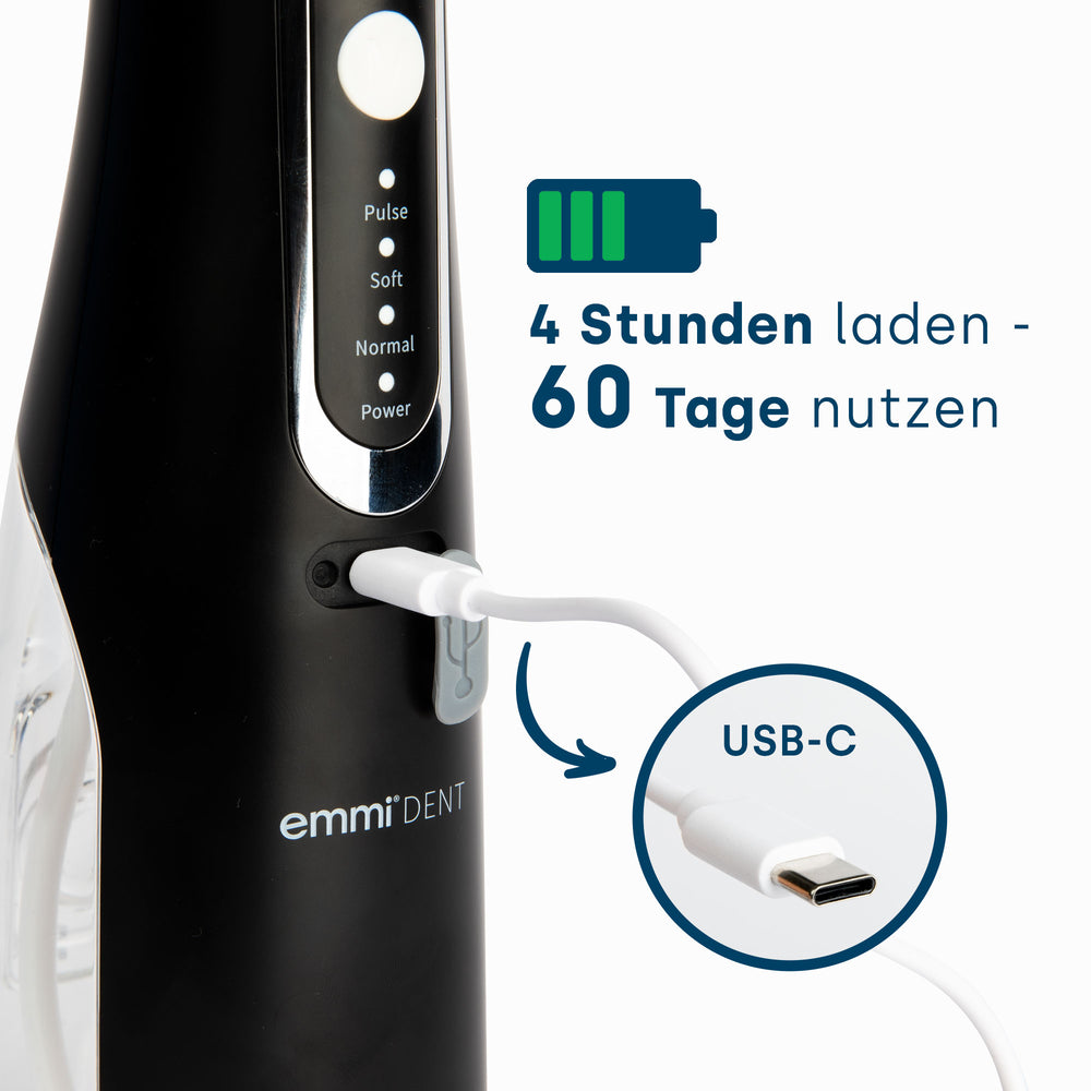 Die emmi-dent Slim verfügt über eine angegebene Akkulaufzeit von 14 Tagen. Die praktische Ladeanzeige informiert Sie stets über den aktuellen Akkustand.