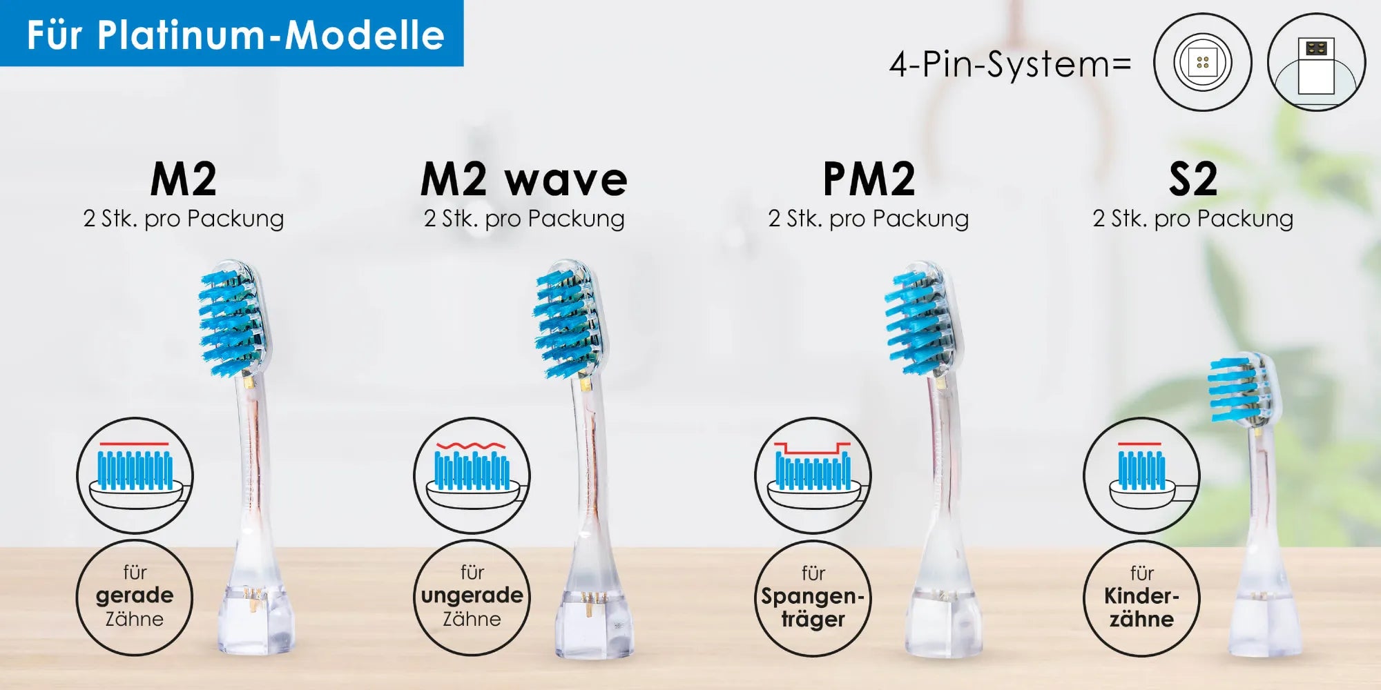 Bei den M2 und M4 Platinum Aufsätzen handelt es sich um die Standard-Bürstenköpfe für Ihre elektrische Zahnbürste mit 100 Prozent Original Ultraschall.